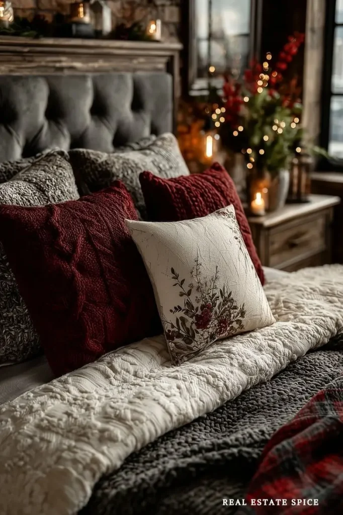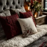 Transform your sofa area into a holiday centerpiece with plush seasonal throw pillows and comfy blankets—you can snag these affordably at sales or even your favorite thrift store.