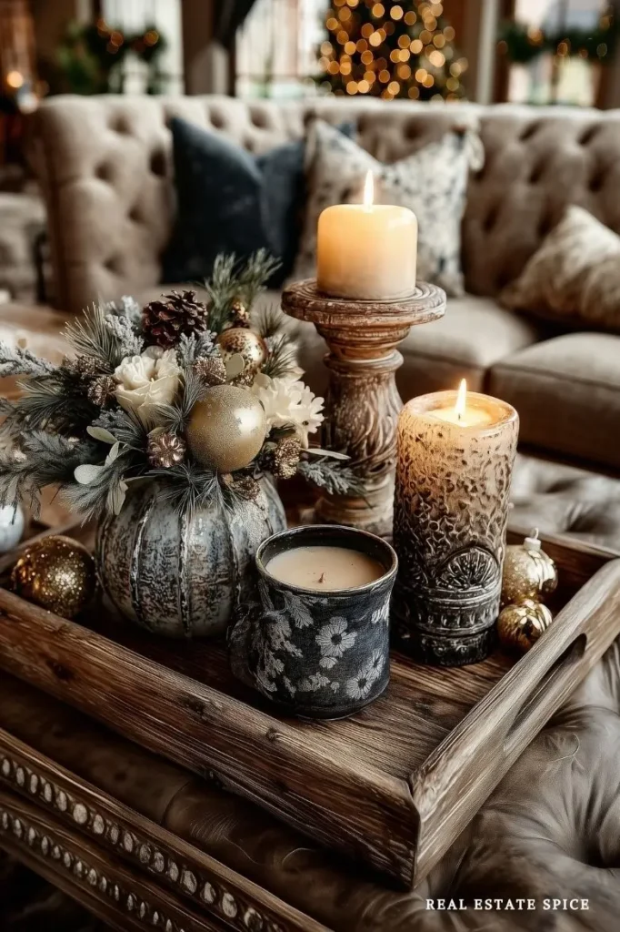 - Coffee table: tray with jar “snow,” bell, and battery candle